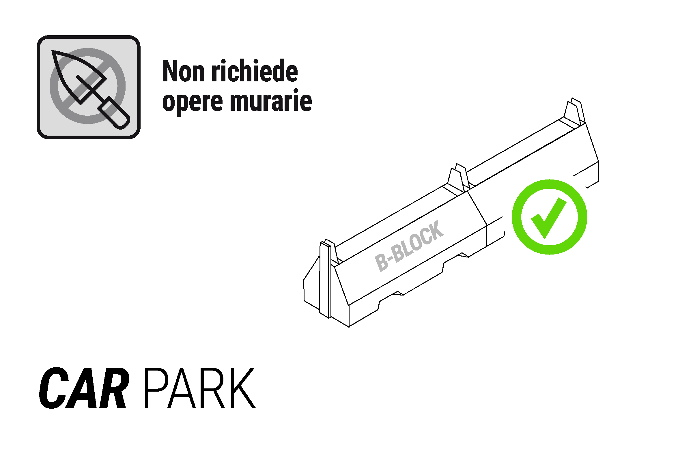 Il CAR-PARK® ha due zavorre mobili B-BLOCK che servono per il posizionamento su qualsiasi suolo senza costose opere di fondazione.