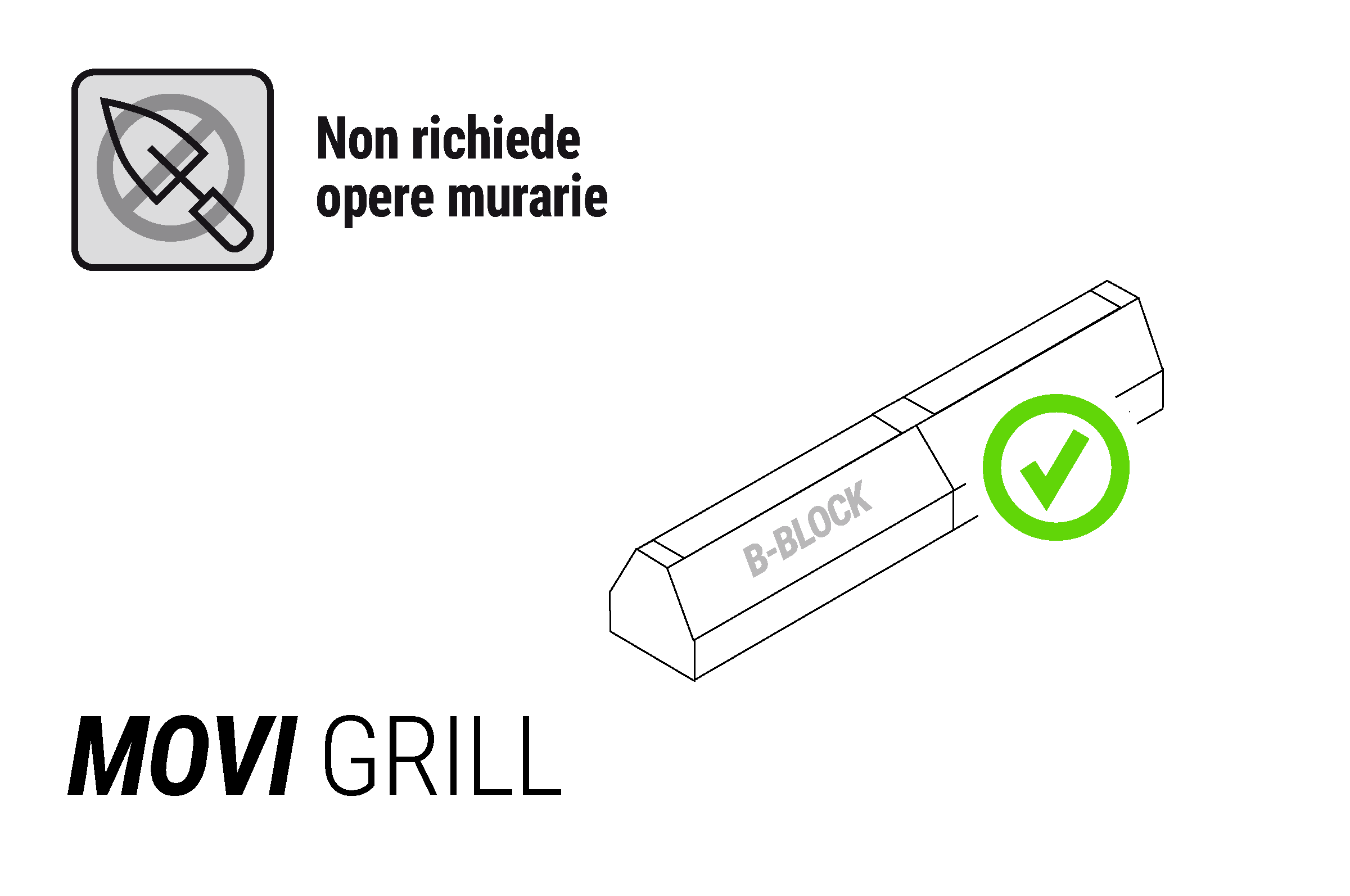 I New Jersey in cemento B-BLOCK® sono disponibili in dimensioni standard. Le dimensioni standard sono 700 x 500 x 2000 mm, 500 x 500 x 1500 mm, 500 x 500 x 2000 mm. In funzione del prodotto vengono utilizzati New Jersey in cemento B-BLOCK con dimensioni diverse. Nel caso di MOVI-GRILL® è utilizzato un New Jersey da 500 x 500 x 2000 mm.